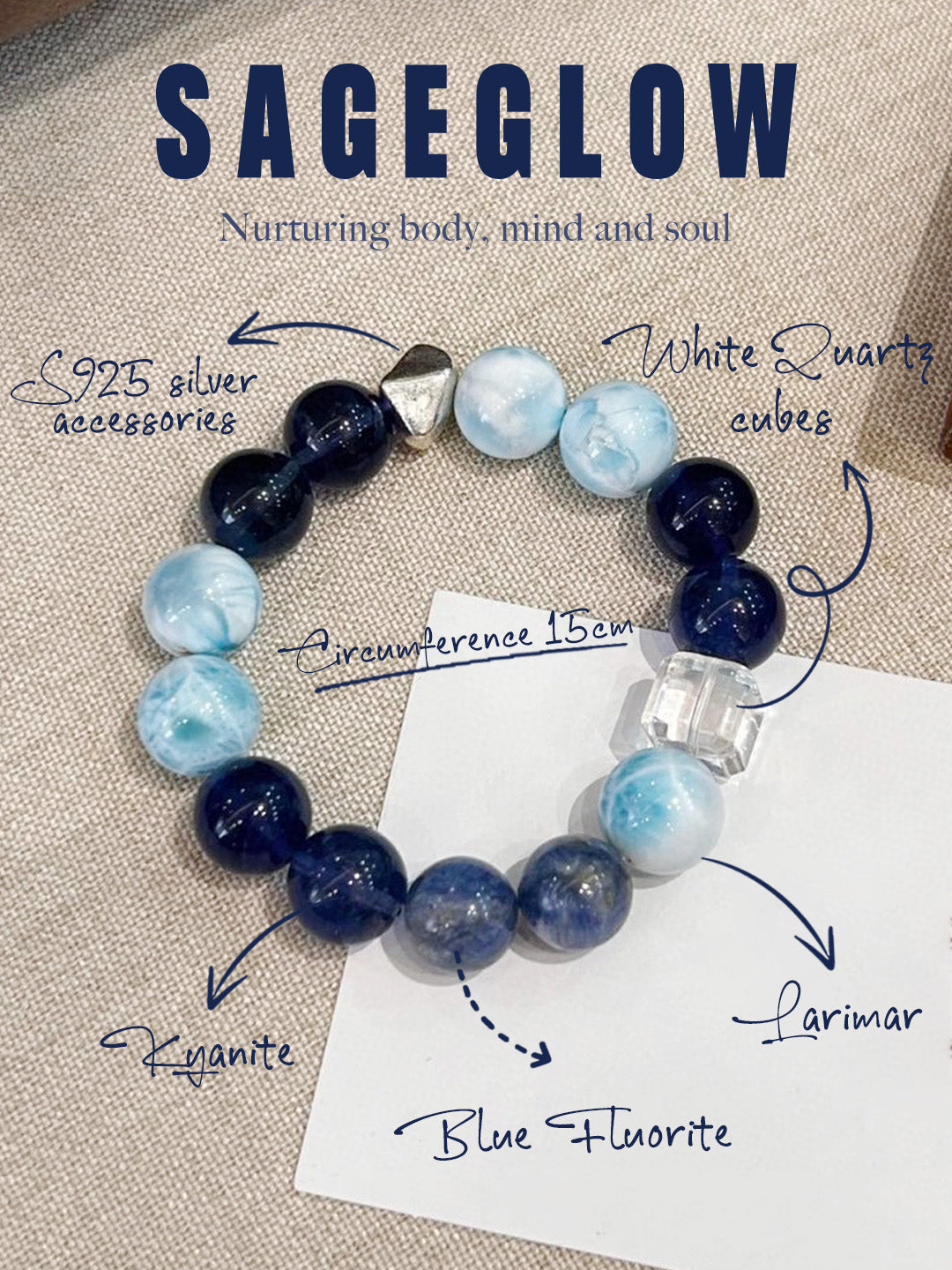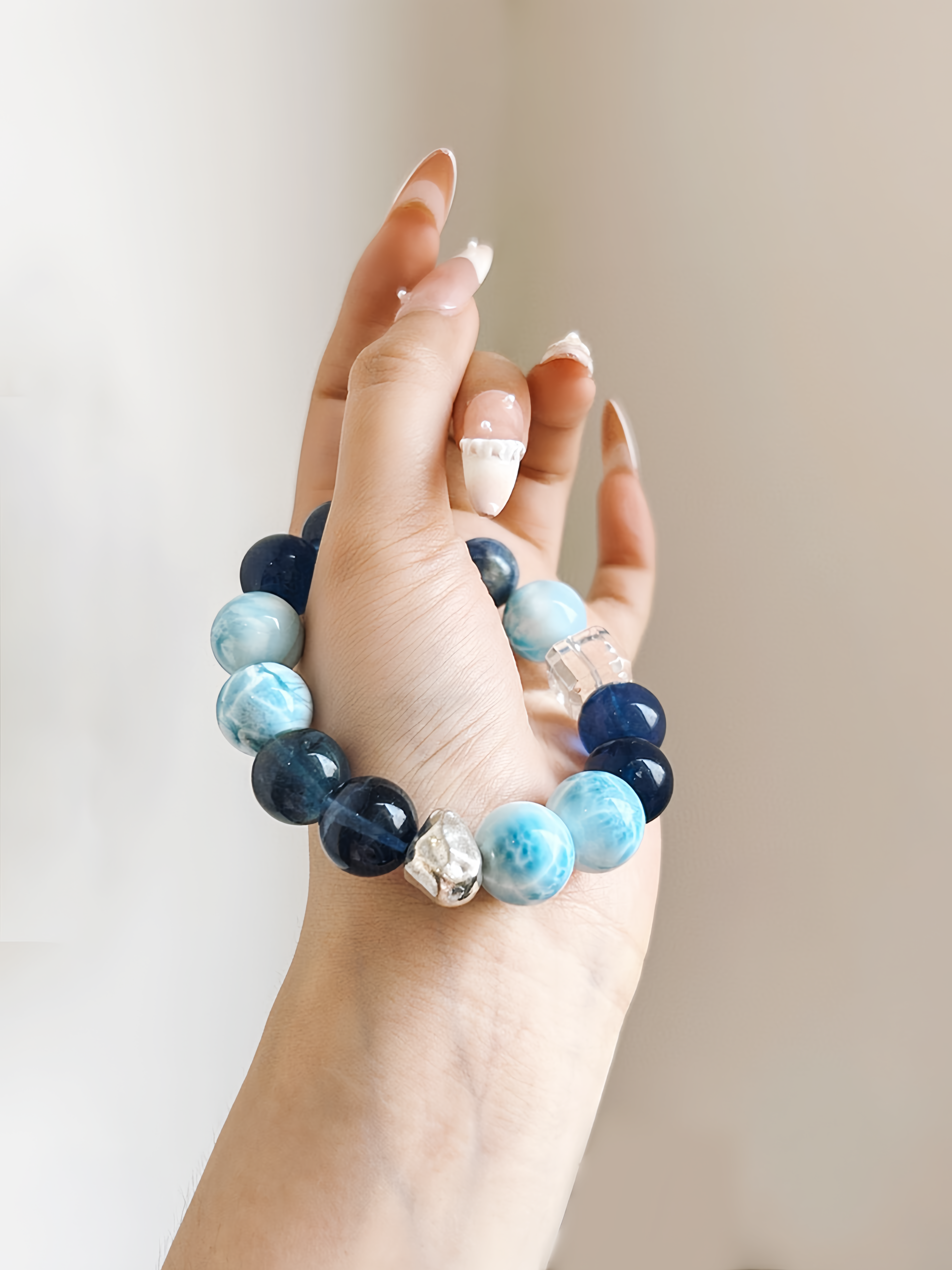 Bead size: 13.5 mm Larimar, 13 mm Blue Fluorite, 12 mm Kyanite, 11 mm White Quartz cubes