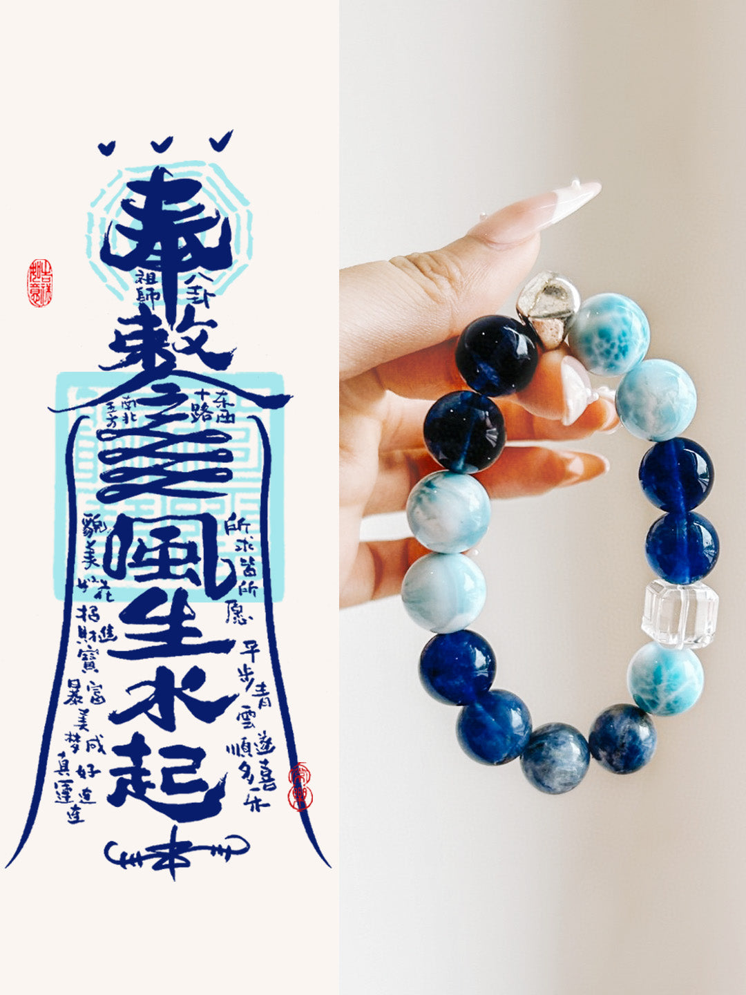 The Azure Spirit Bracelet is a limited edition collectible that draws inspiration from the ocean's calming beauty and energizing waves. This exquisite piece masterfully combines four powerful gemstones, each selected for its unique properties, to create a harmonious blend aligned with the ancient Chinese philosophy of Wu Xing (Five Elements).
