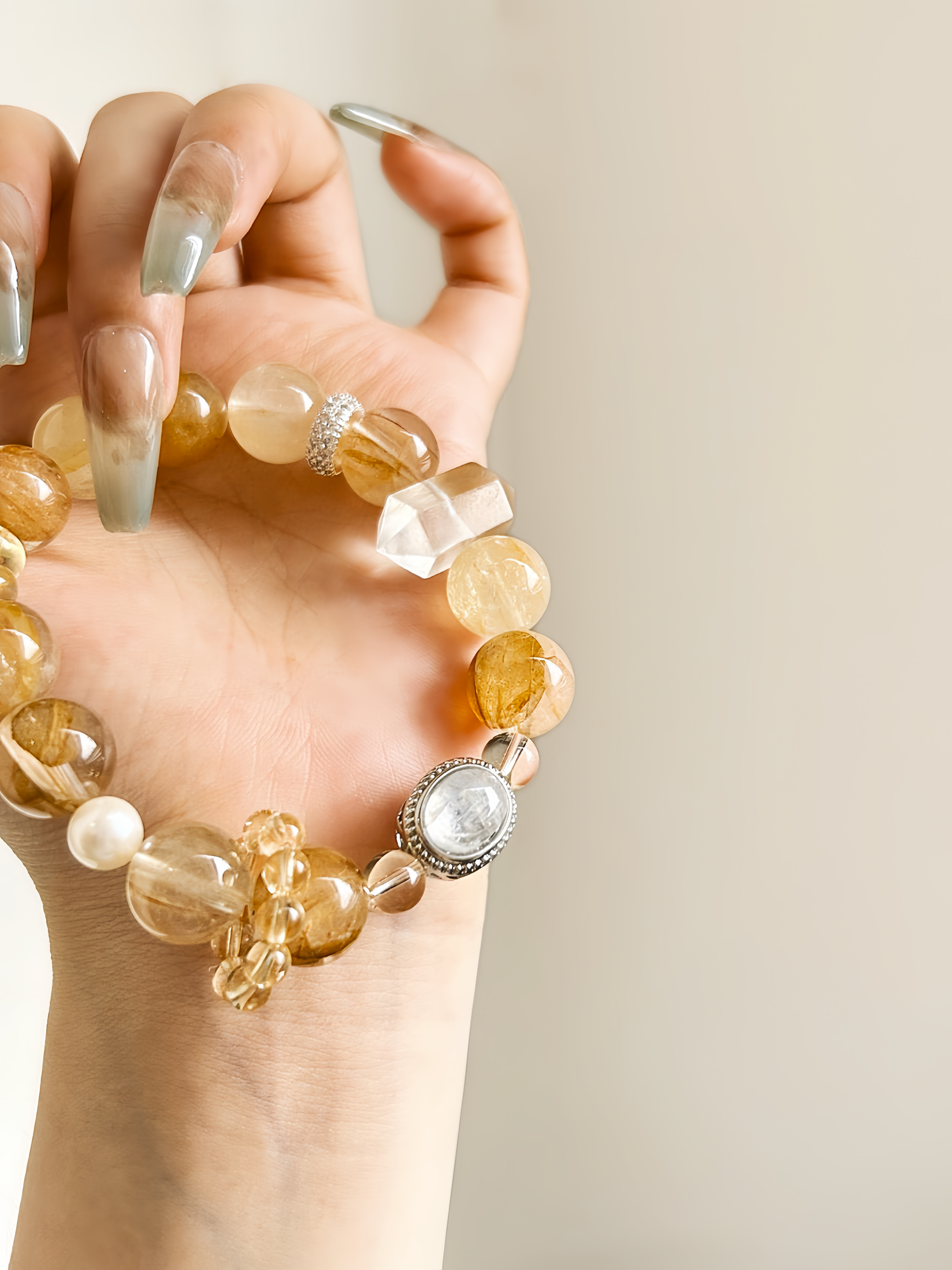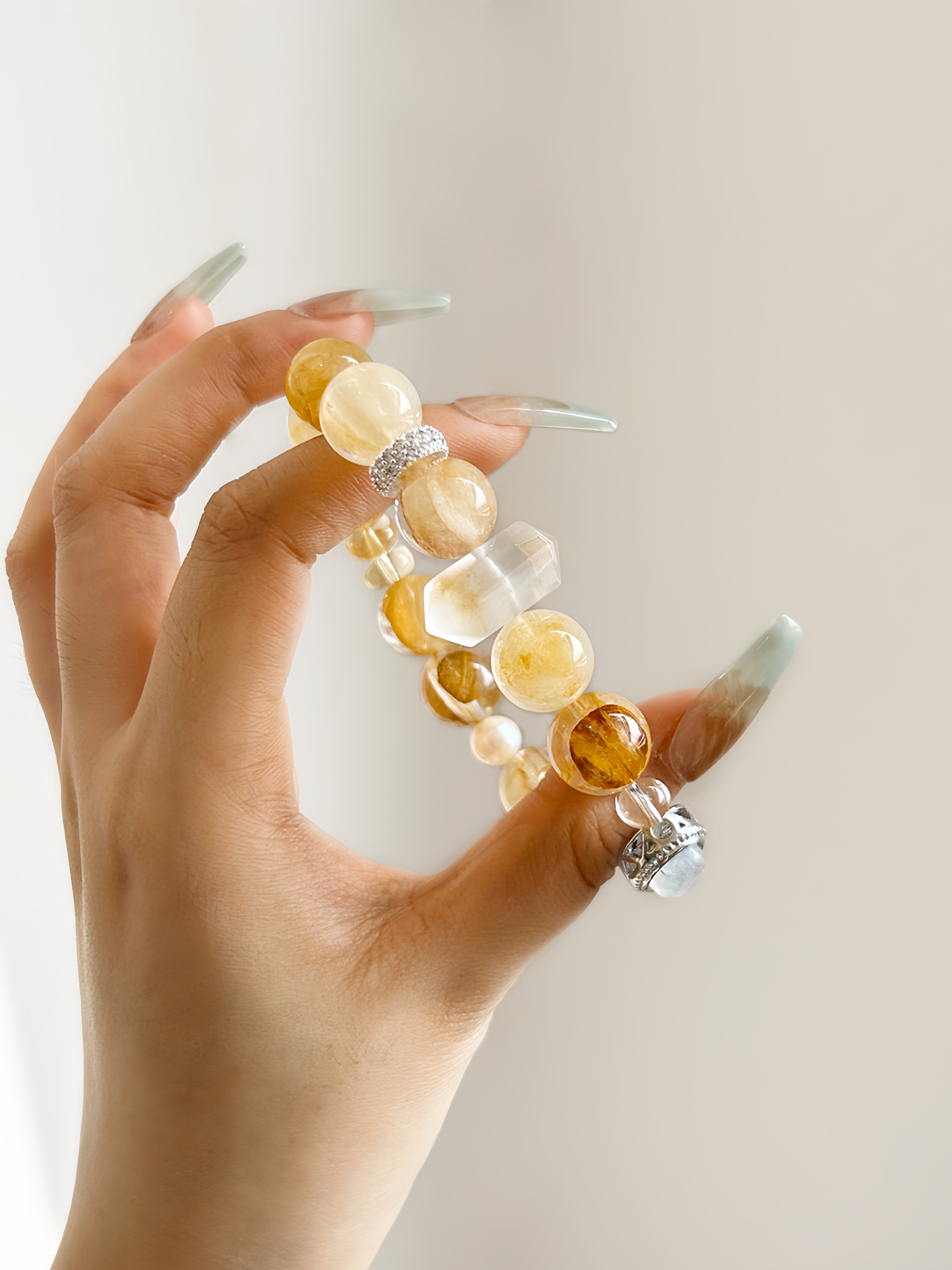 As an embodiment of the Earth () element, this bracelet strengthens the connection to ones roots, providing emotional balance, stability, and a sense of calm. The warm yellow tones and lustrous pearls make this piece highly versatile, effortlessly enhancing both casual and formal outfits.