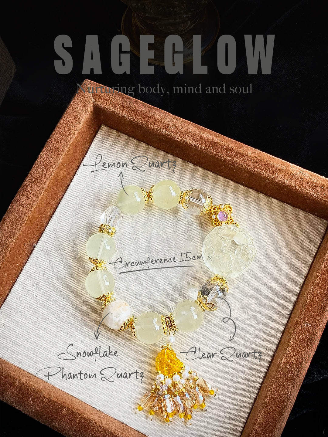 The Infinite Glow Bracelet is an exquisite piece that blends the vibrant beauty of Lemon Quartz with the elegant healing properties of Clear Quartz and Snowflake Phantom Quartz. This bracelet is categorized under the Metal (金) element in the Wu Xing (Five Elements) system, making it a powerful symbol of clarity, protection, and strength.