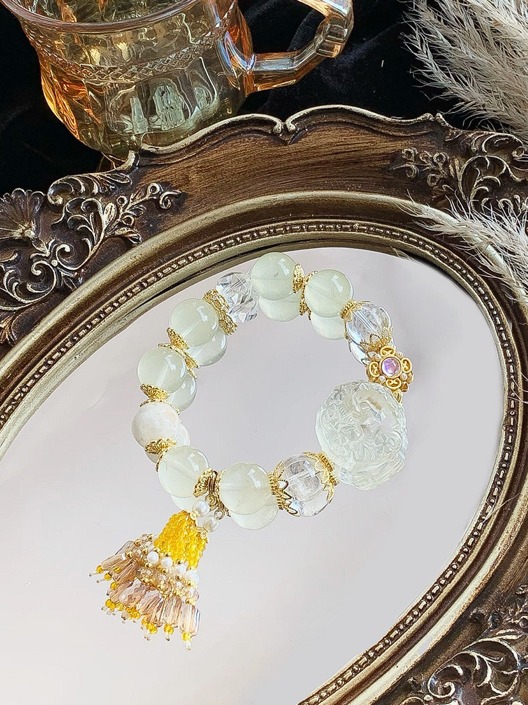Lemon Quartz, representing the Metal element, enhances optimism, prosperity, and self-confidence. It is also known to dispel negativity and aid in concentration, making it a perfect stone for personal growth and mental clarity. The carved Lemon Quartz bead, adorned with traditional Chinese auspicious patterns, adds cultural depth and significance to the design, symbolizing blessings and good fortune.