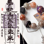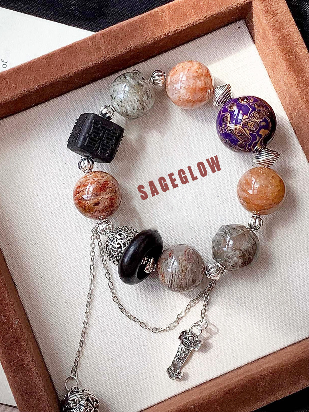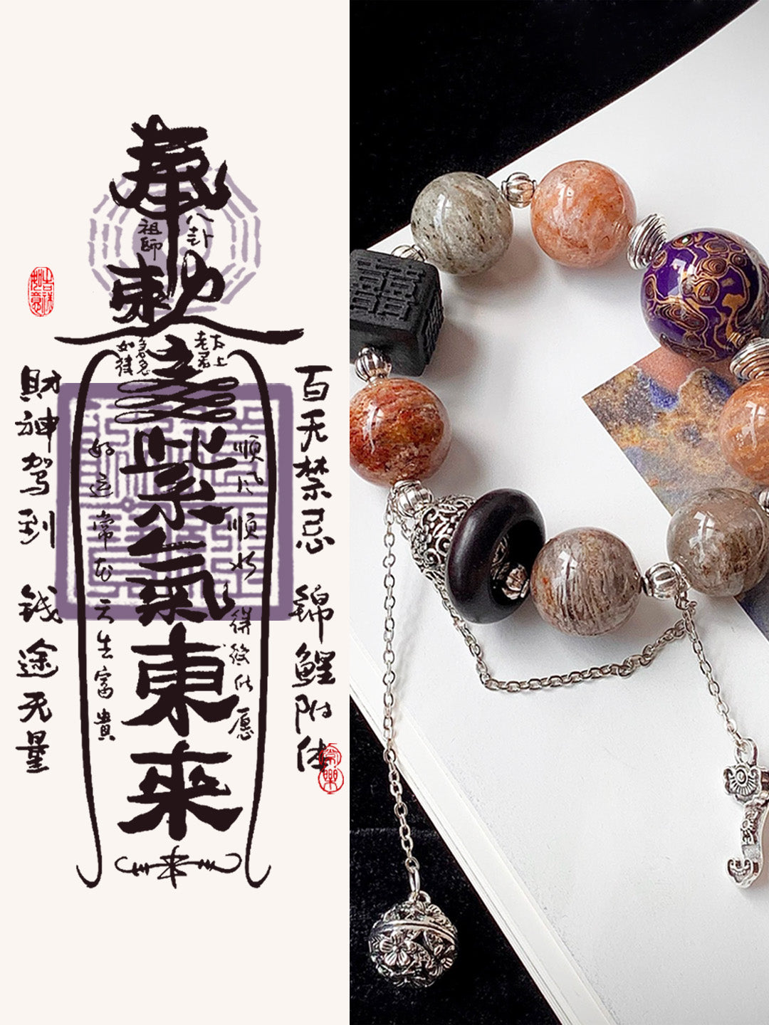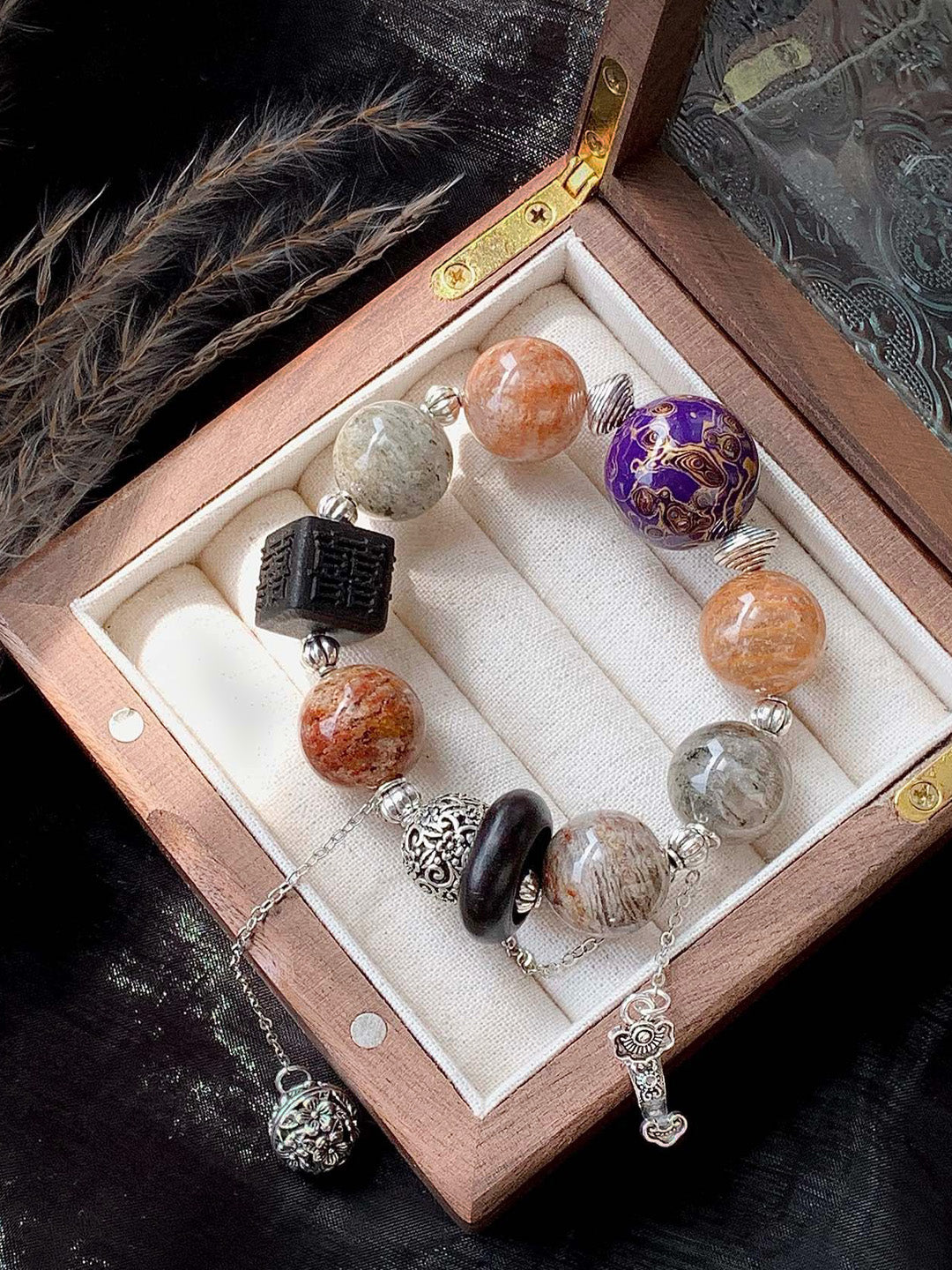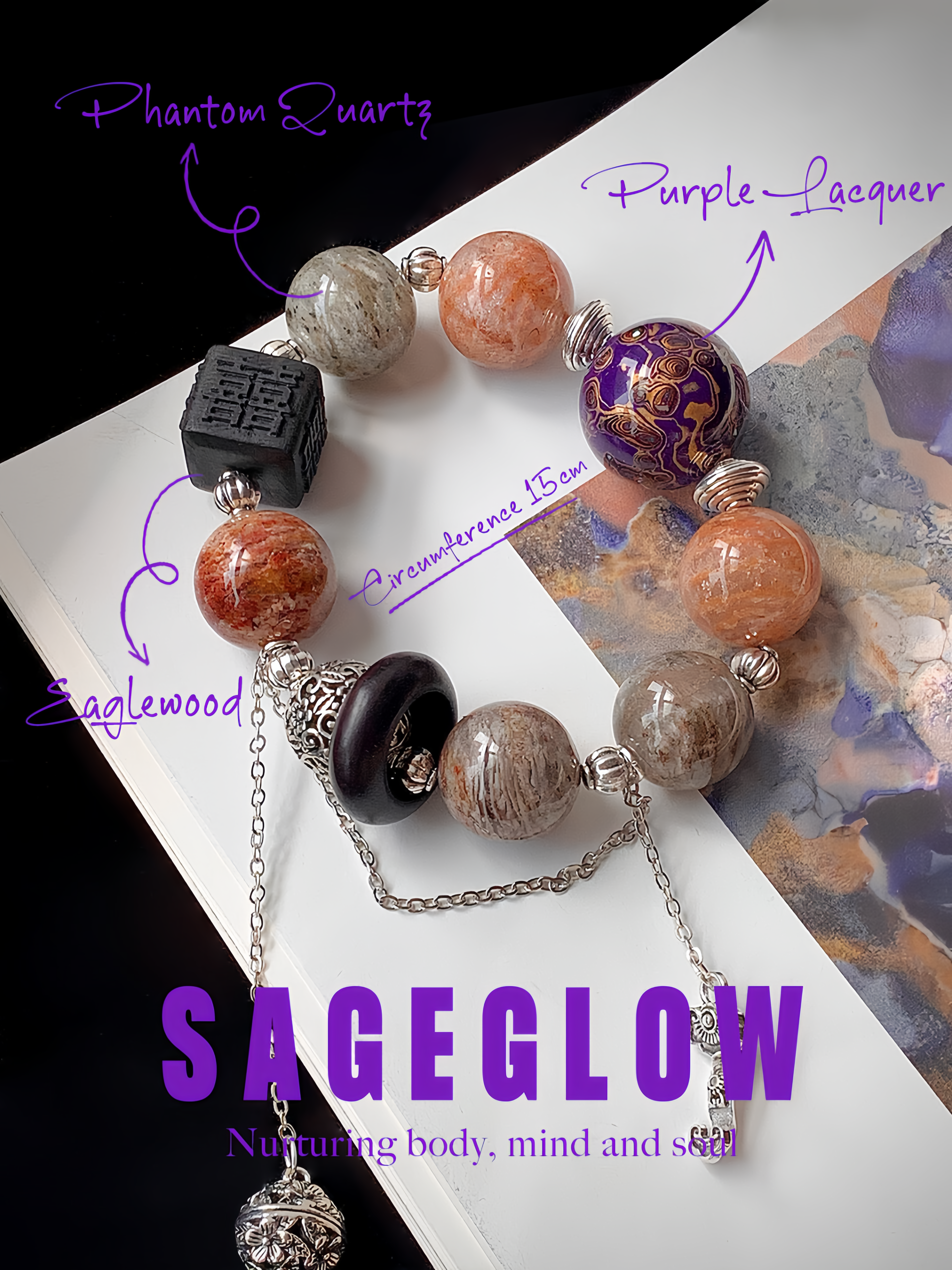 The deep purple lacquer bead, representing fire, sparks creativity, wisdom, and transformation, while the Phantom Quartz, linked to both water and earth elements, enhances clarity, emotional healing, and grounding energy. The Agarwood, symbolizing wood, brings resilience and fosters a deep connection to nature, with its intricate carving of the “Double Happiness” symbol, signifying the arrival of joy, love, and auspicious events. Adorned with exquisite “Ruyi” and “Silk Ball” charms, symbols of peace, good fortune, and the smooth unfolding of success.
