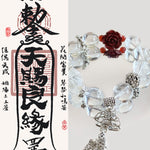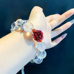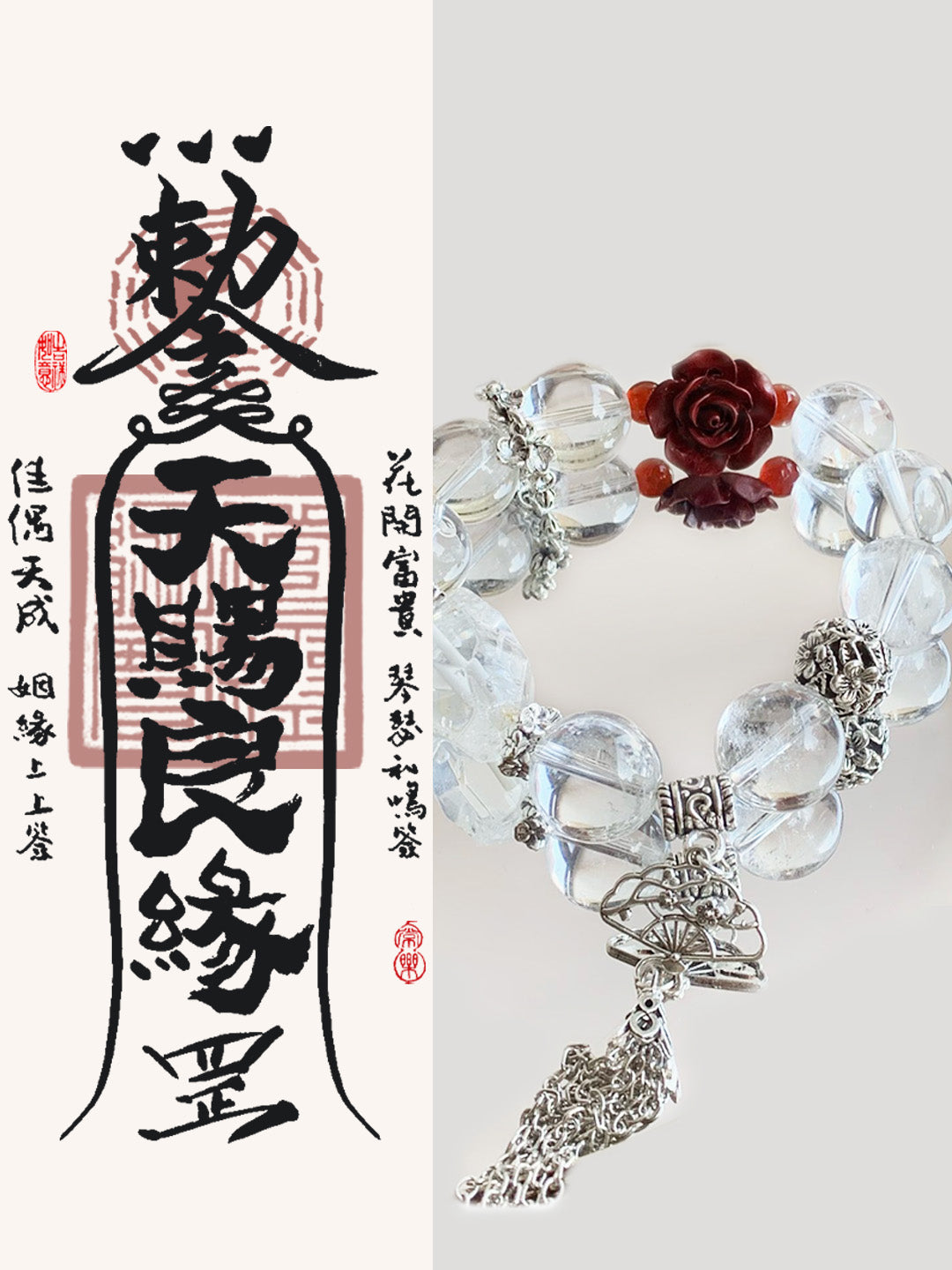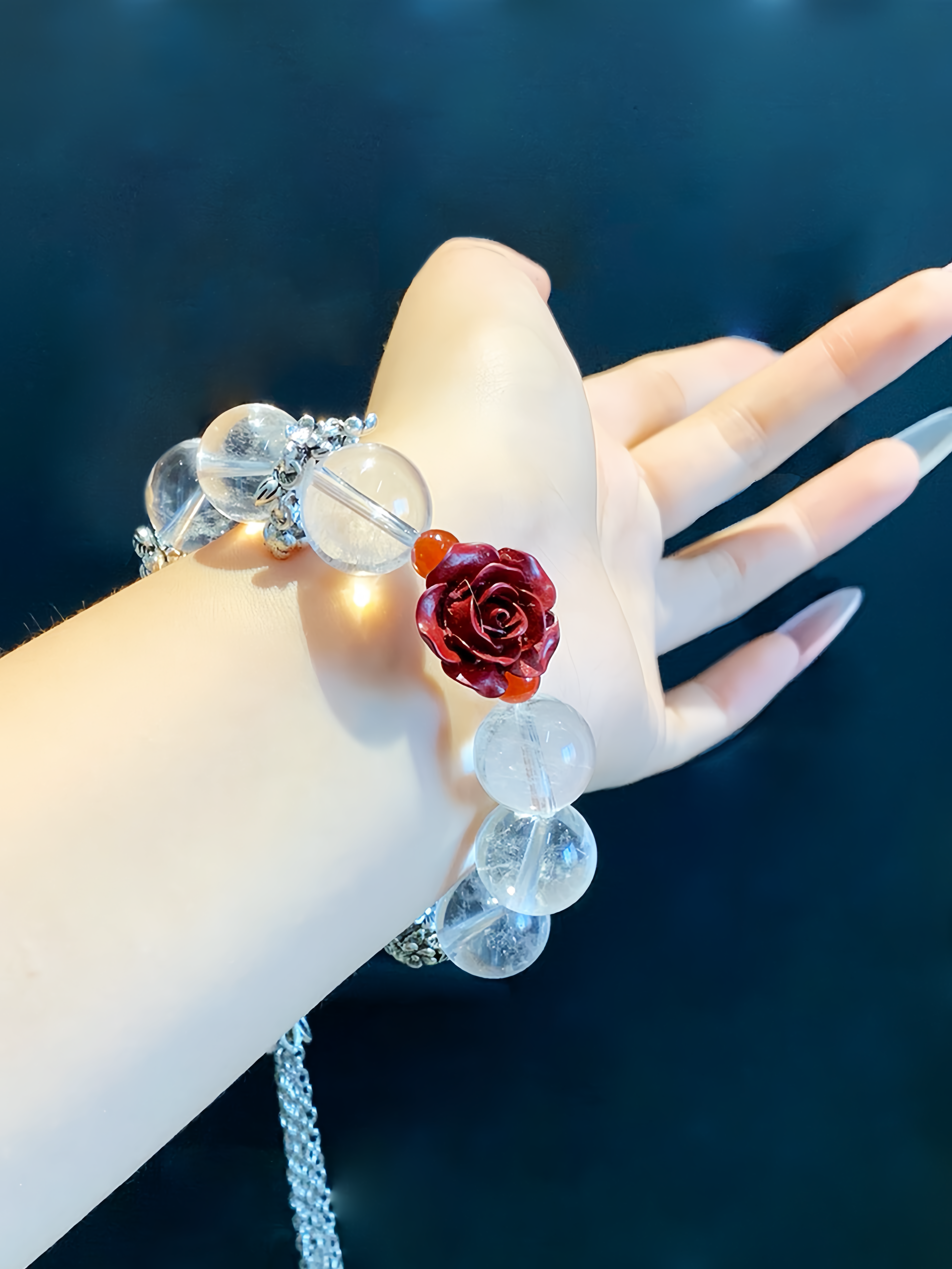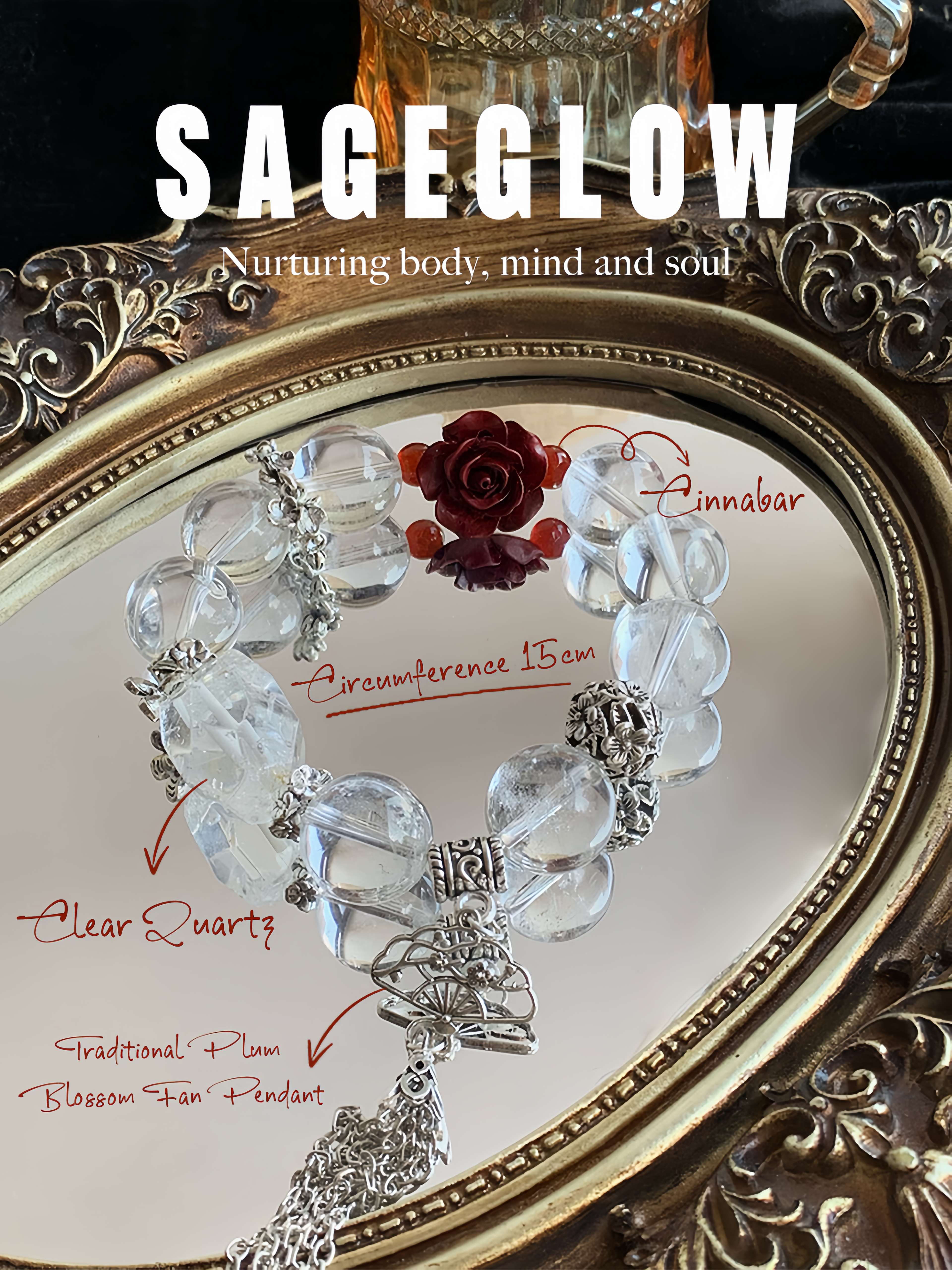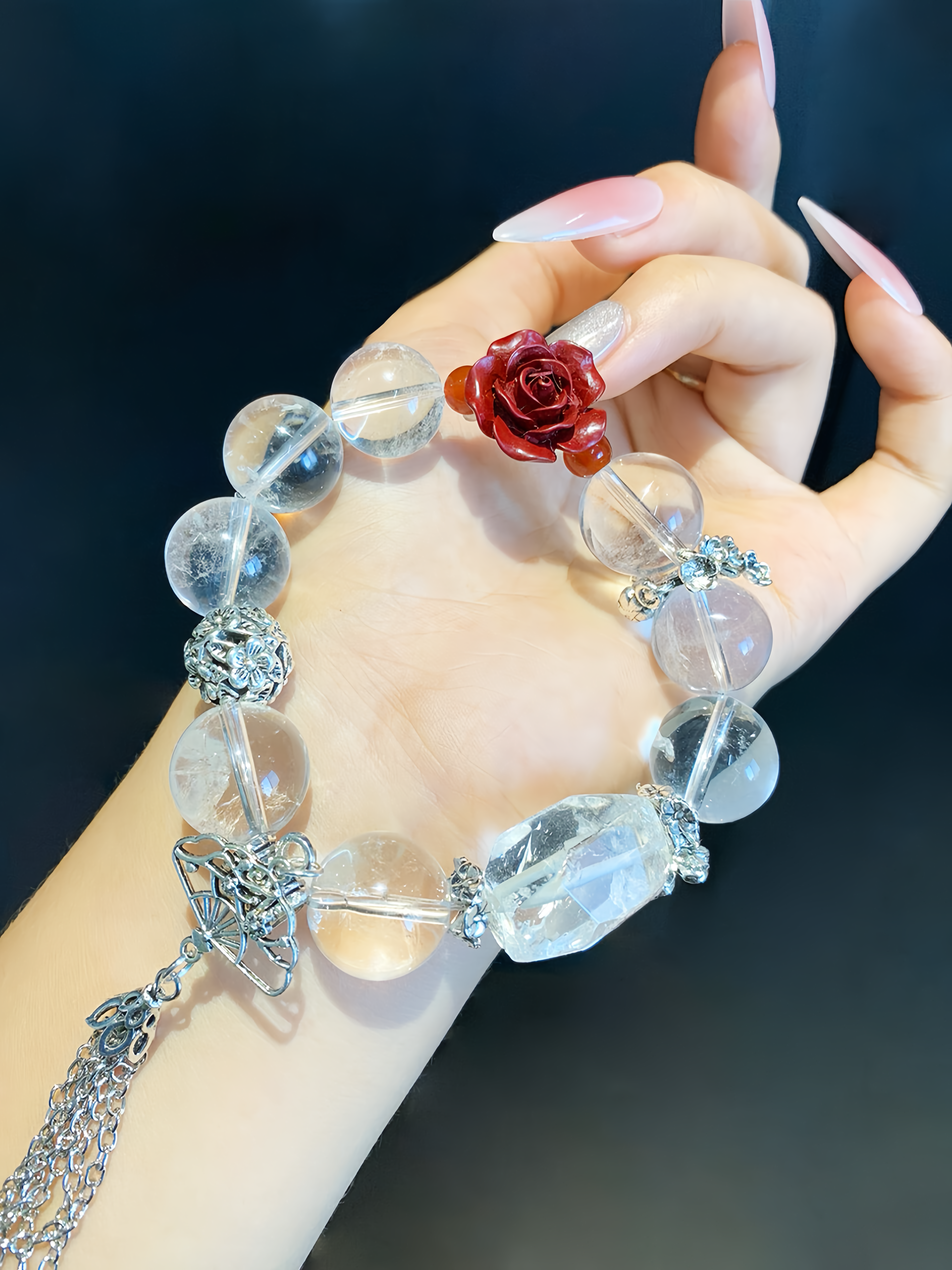 璀璨玫瑰手链将中国传统设计与现代优雅巧妙融合。这款手链由白水晶和朱砂打造,并饰以传统的梅花扇吊坠,彰显优雅高贵。它属于五行中的金元素,象征着纯洁、守护和清澈。