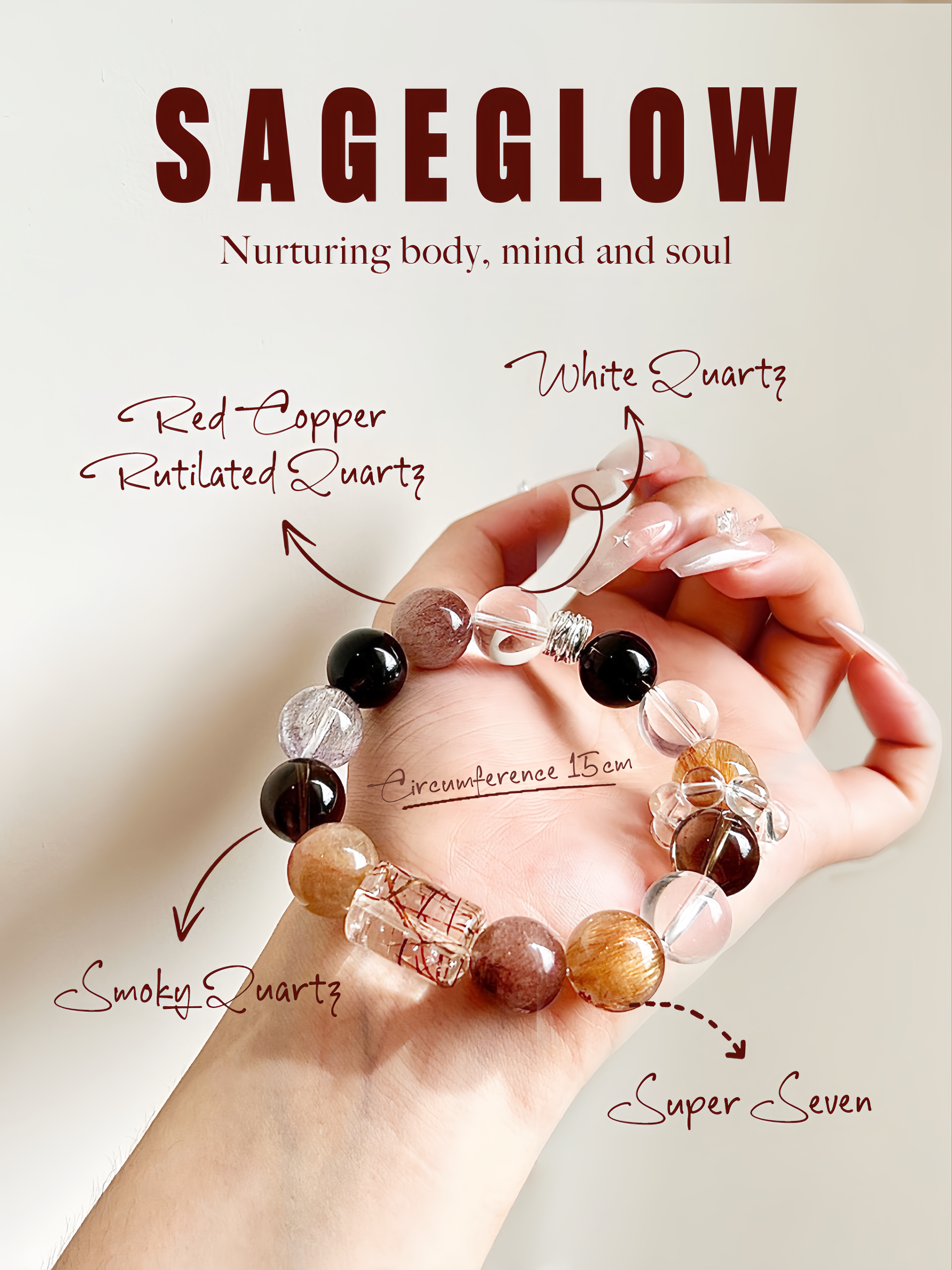 Red Copper Rutilated Quartz, with its golden-red threads, represents the Fire element, sparking creativity, passion, and personal power. Smoky Quartz, connected to the Earth element, provides grounding and stability, helping to absorb and release negative energy. The Super Seven crystal, known for its powerful spiritual properties, embodies the Metal element, bringing clarity, protection, and a deeper connection to the universe. White Quartz, linked to the Water element, purifies the aura and emotions, fostering emotional clarity and peace.