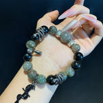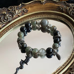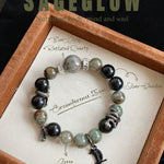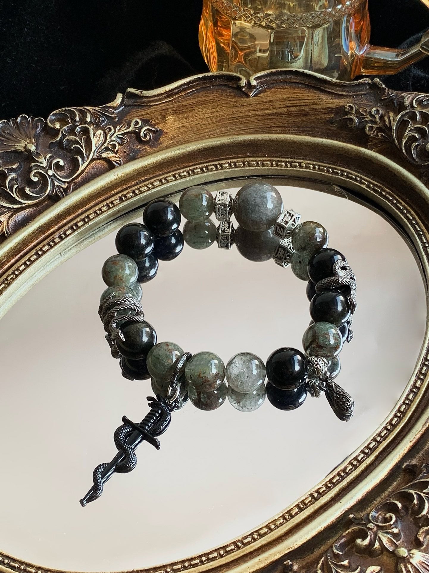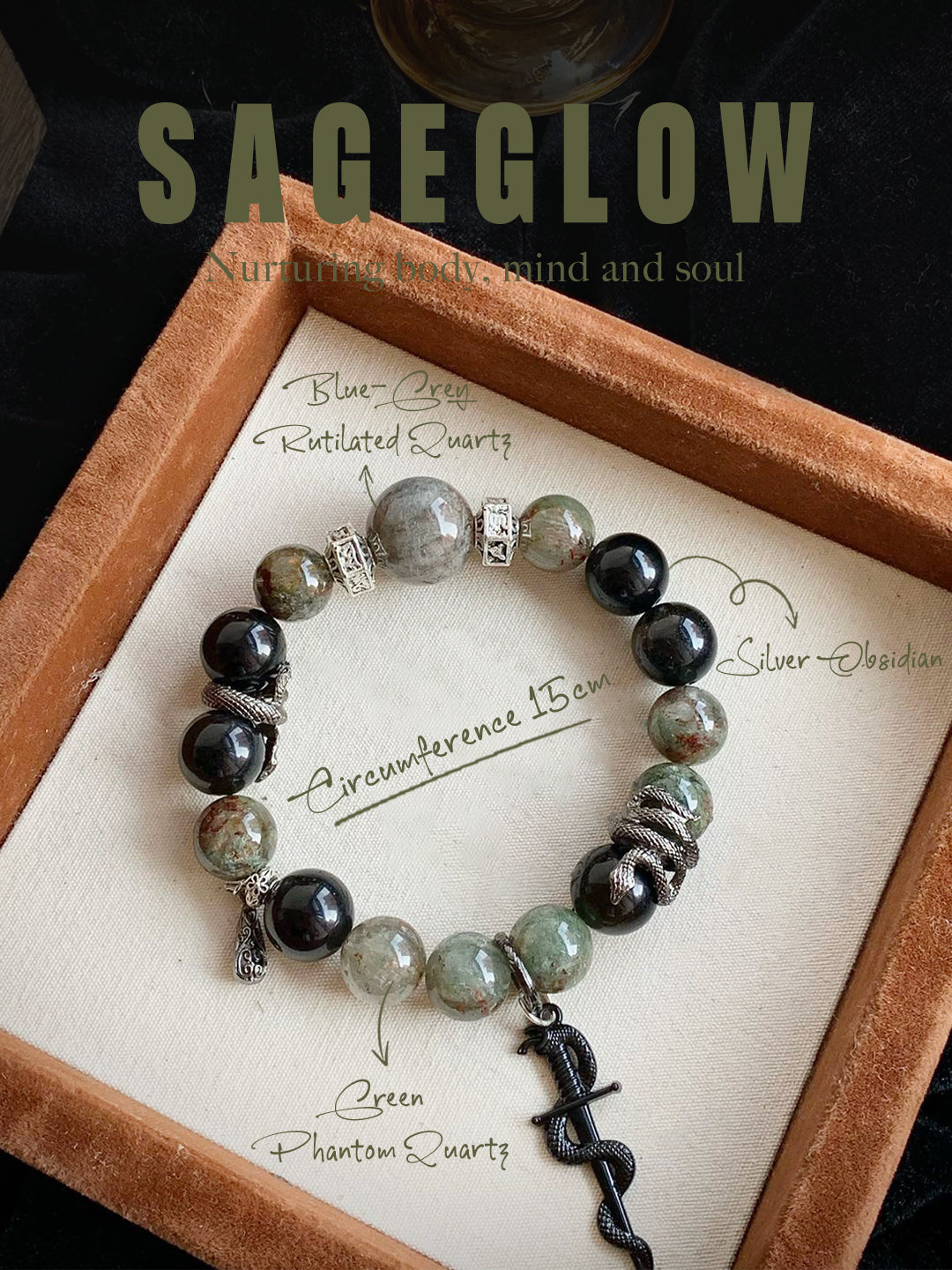 The Serpent’s Spirit Bracelet draws its power from the Wood (木) element in the Wu Xing (Five Elements) system, embodying growth, renewal, and spiritual depth. Crafted from Green Phantom Quartz, Silver Obsidian, and Blue-Grey Rutilated Quartz, this bracelet harnesses a balance of grounding and revitalizing energies. The Green Phantom Quartz fosters inner strength and emotional growth, while Silver Obsidian protects the wearer, deflecting negativity and enhancing clarity. Blue-grey rutilated Quartz weaves together intuition and insight.