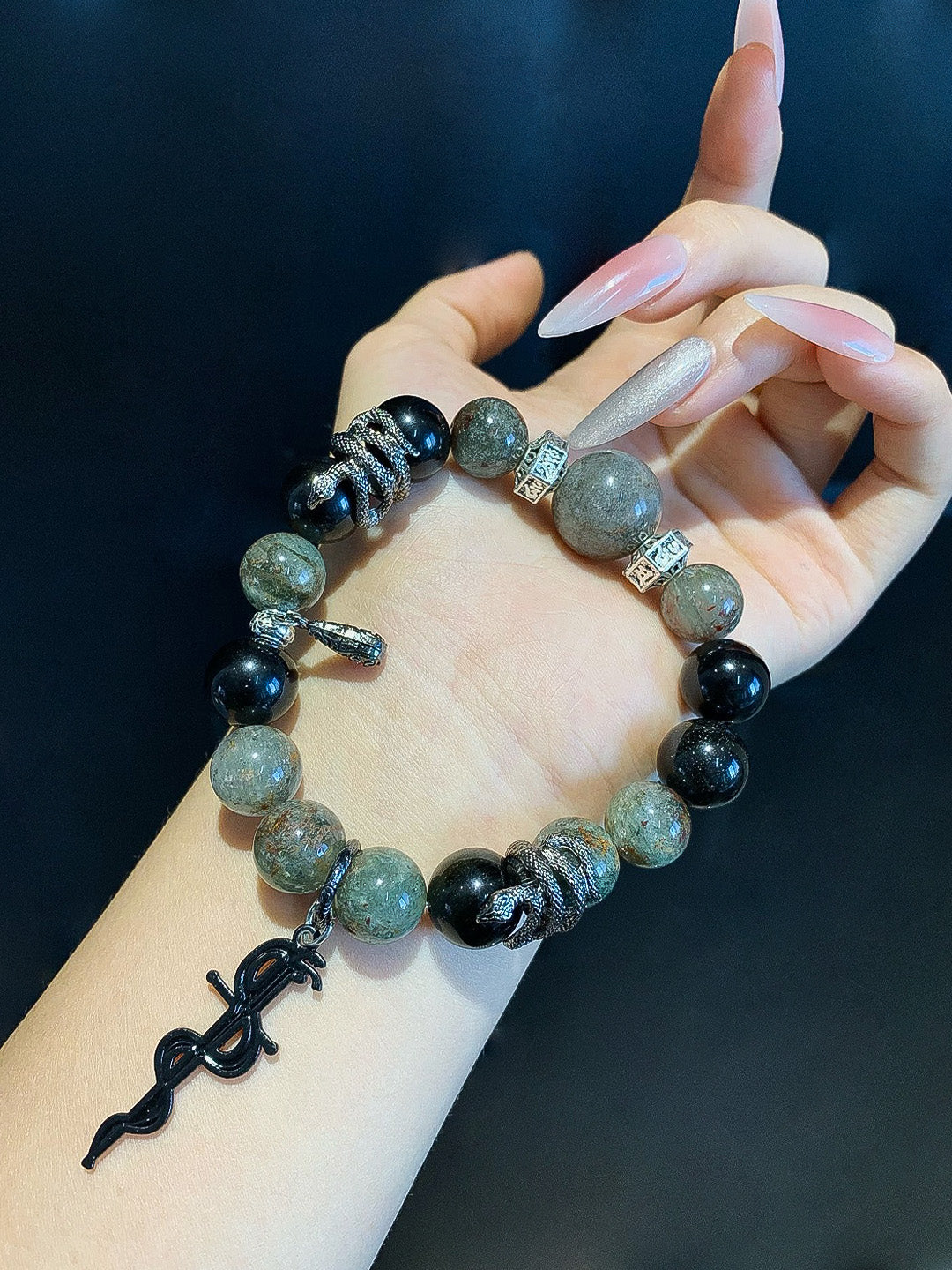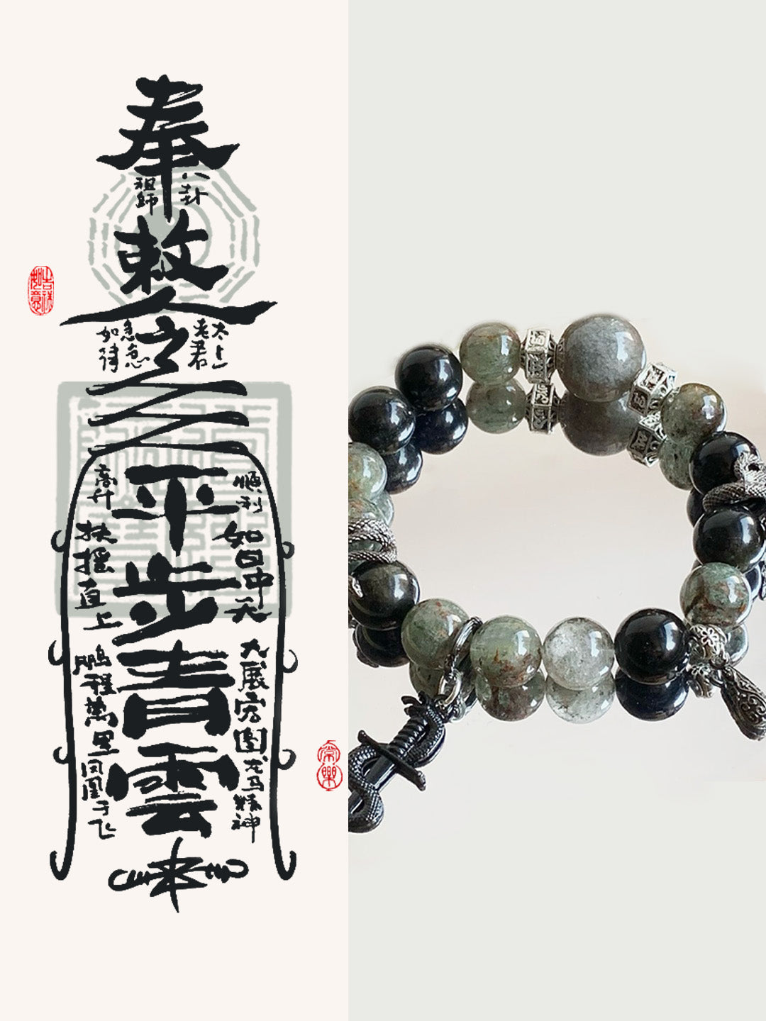 The striking design features a black snake coiled around a sacred sword pendant, symbolizing transformation and protection. The inclusion of silver snake accessories and traditional Chinese patterns further enhances the artistic and spiritual quality of the bracelet, making it both a unique and meaningful collectible.
