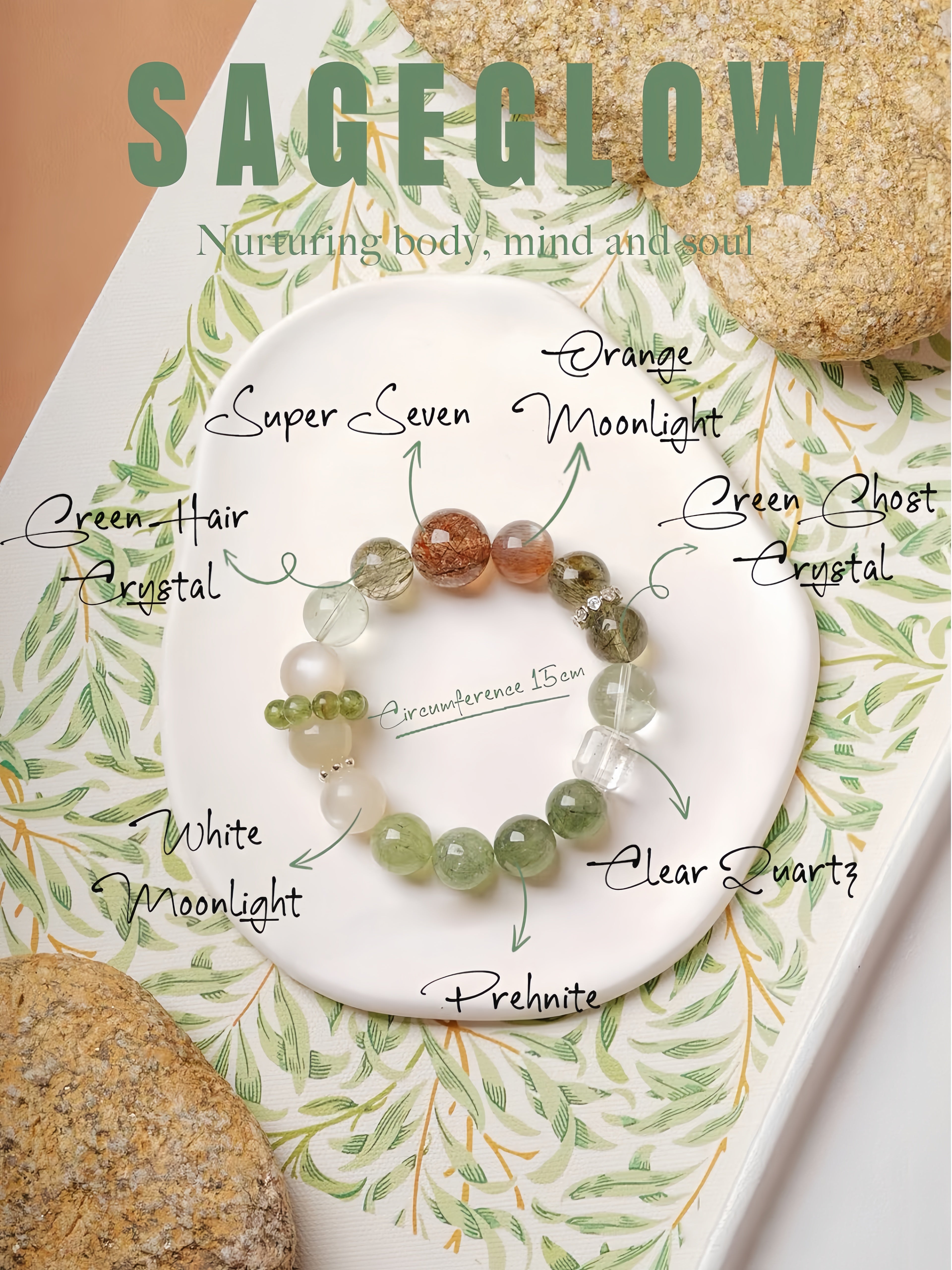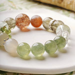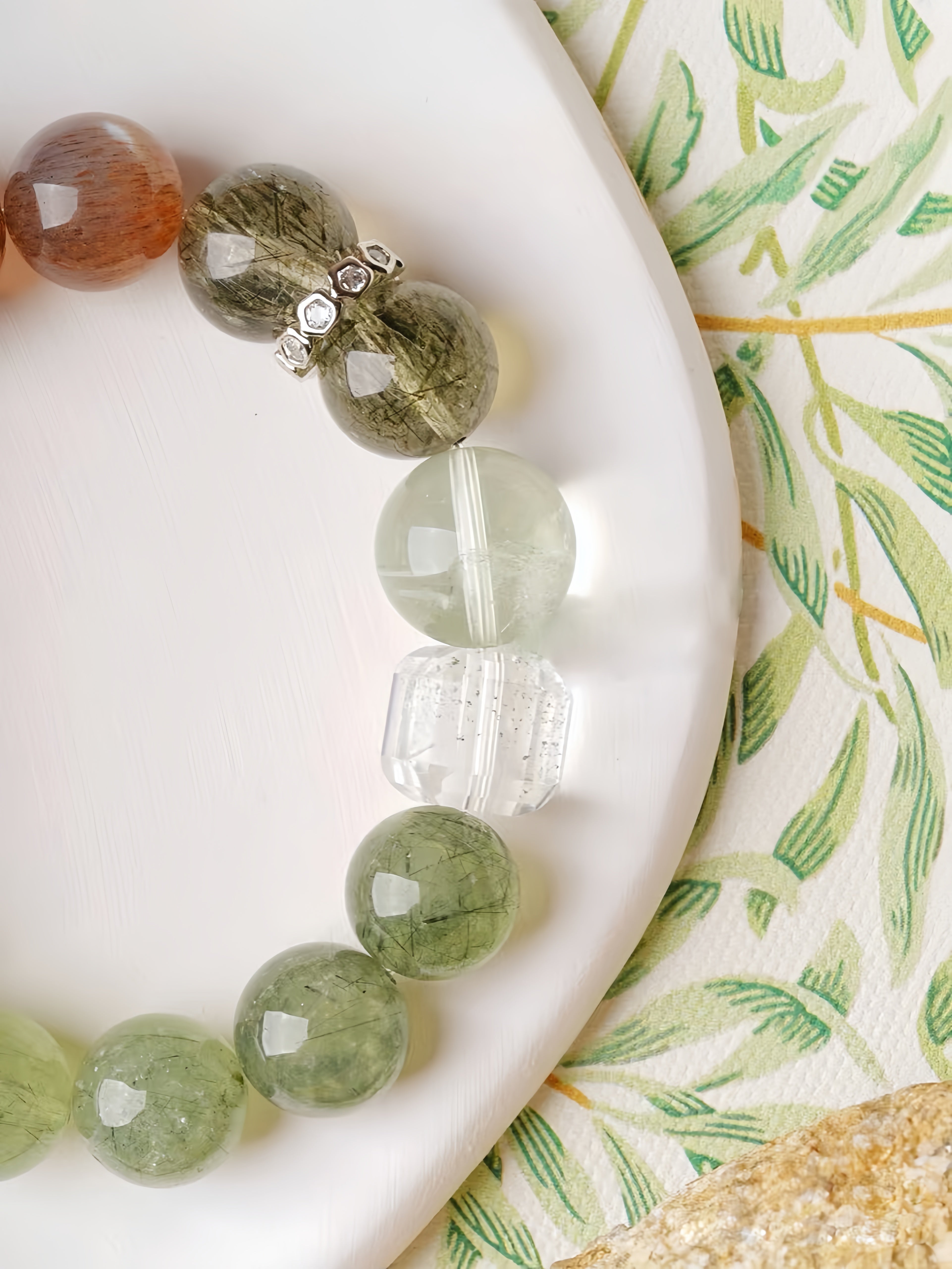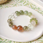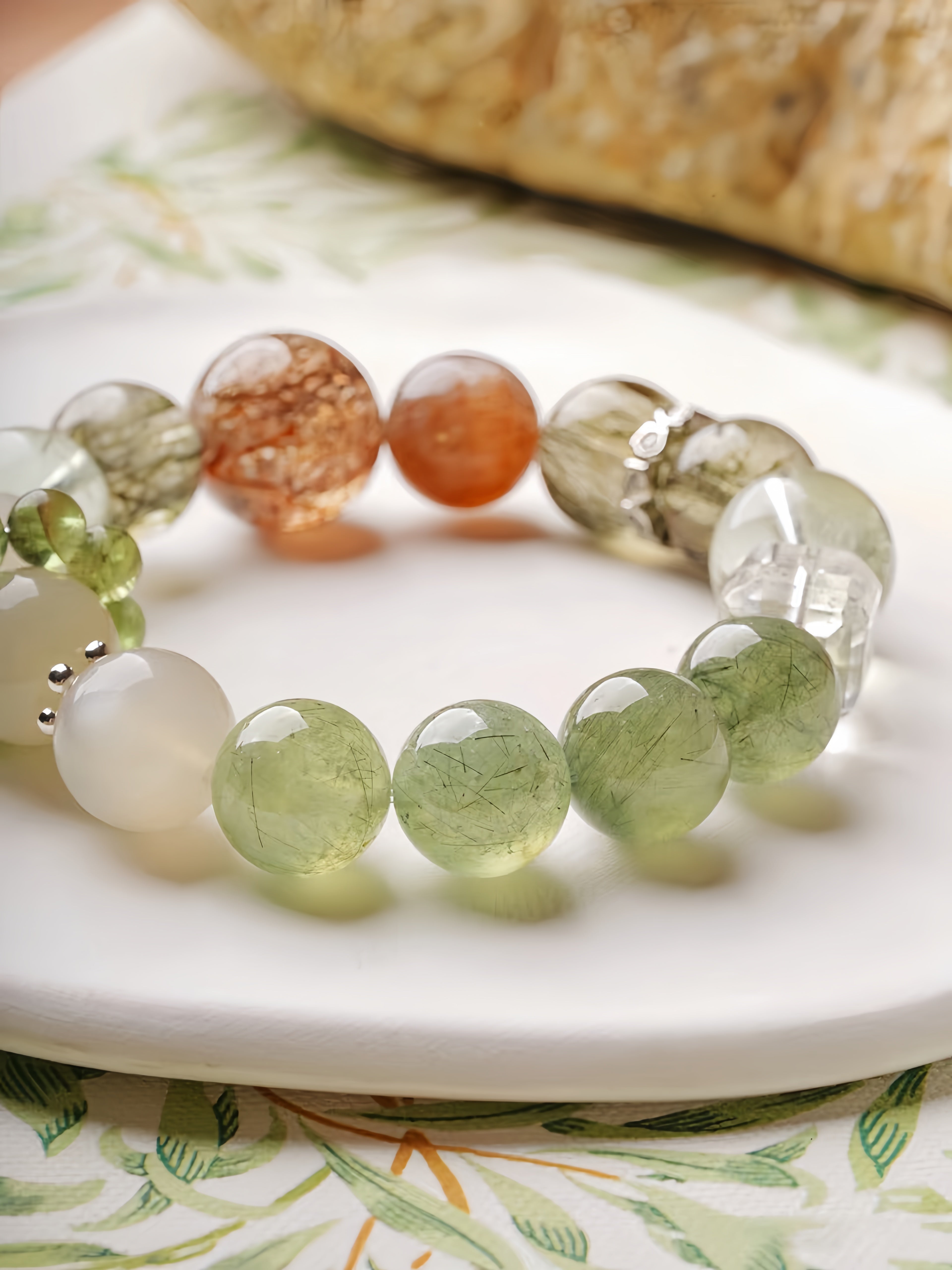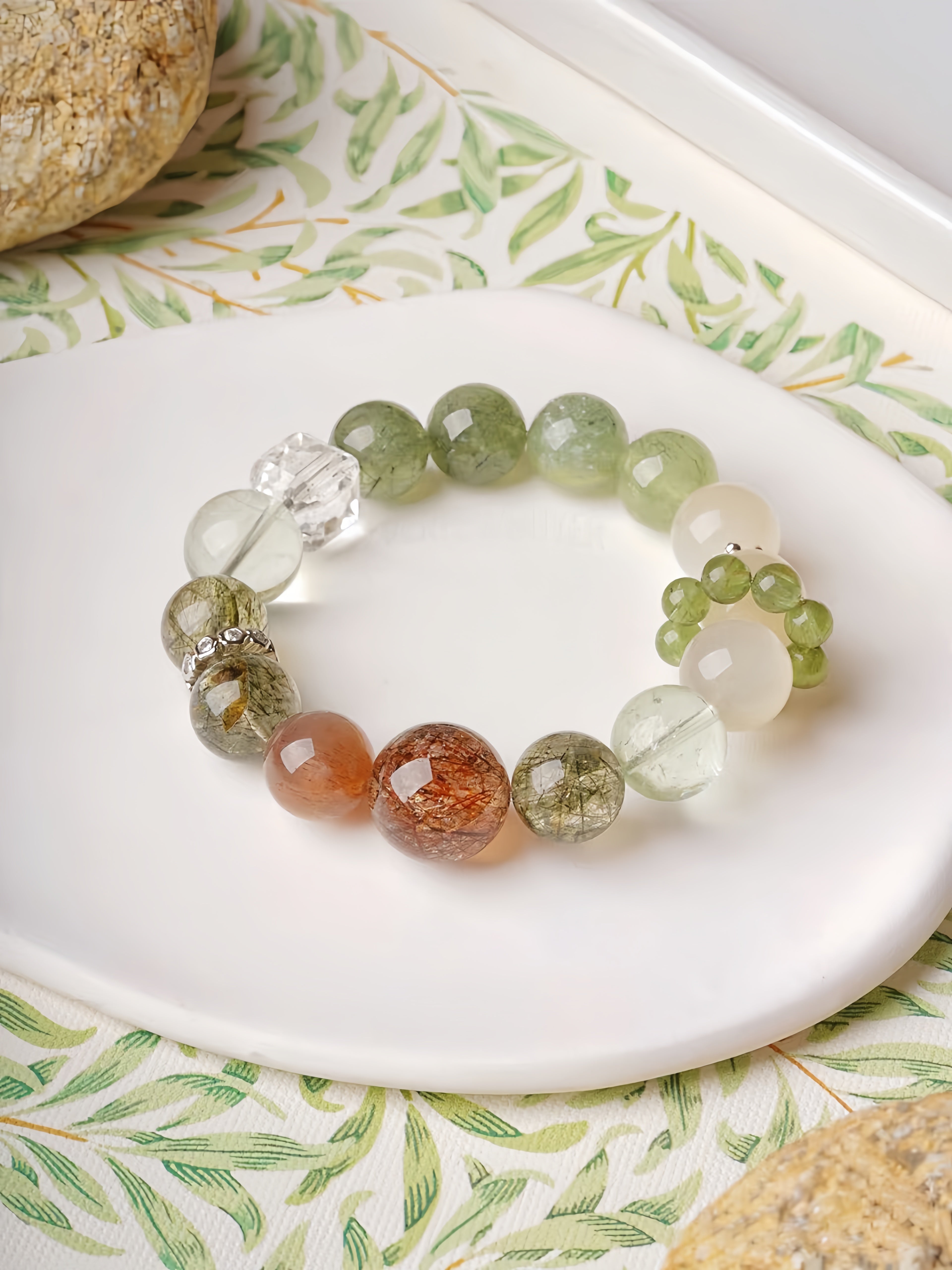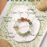 The Verdant Dreams Bracelet is a designer's special edition, inspired by the serene beauty of nature. Its green tones evoke lush bamboo forests and blooming freesia fields, resembling a tranquil Chinese landscape painting. This bracelet combines the unique energies of carefully selected gemstones: Orange Moonstone nurtures vitality and emotional warmth, White Moonstone guards love and fosters harmony, Prehnite and Rutilated Quartz inspire growth and renewal, Black Tourmaline Quartz grounds the spirit while attracting prosperity, and Green Phantom Quartz anchors stability and harmony. Subtle silver accents enhance the bracelet’s timeless and delicate aesthetic.