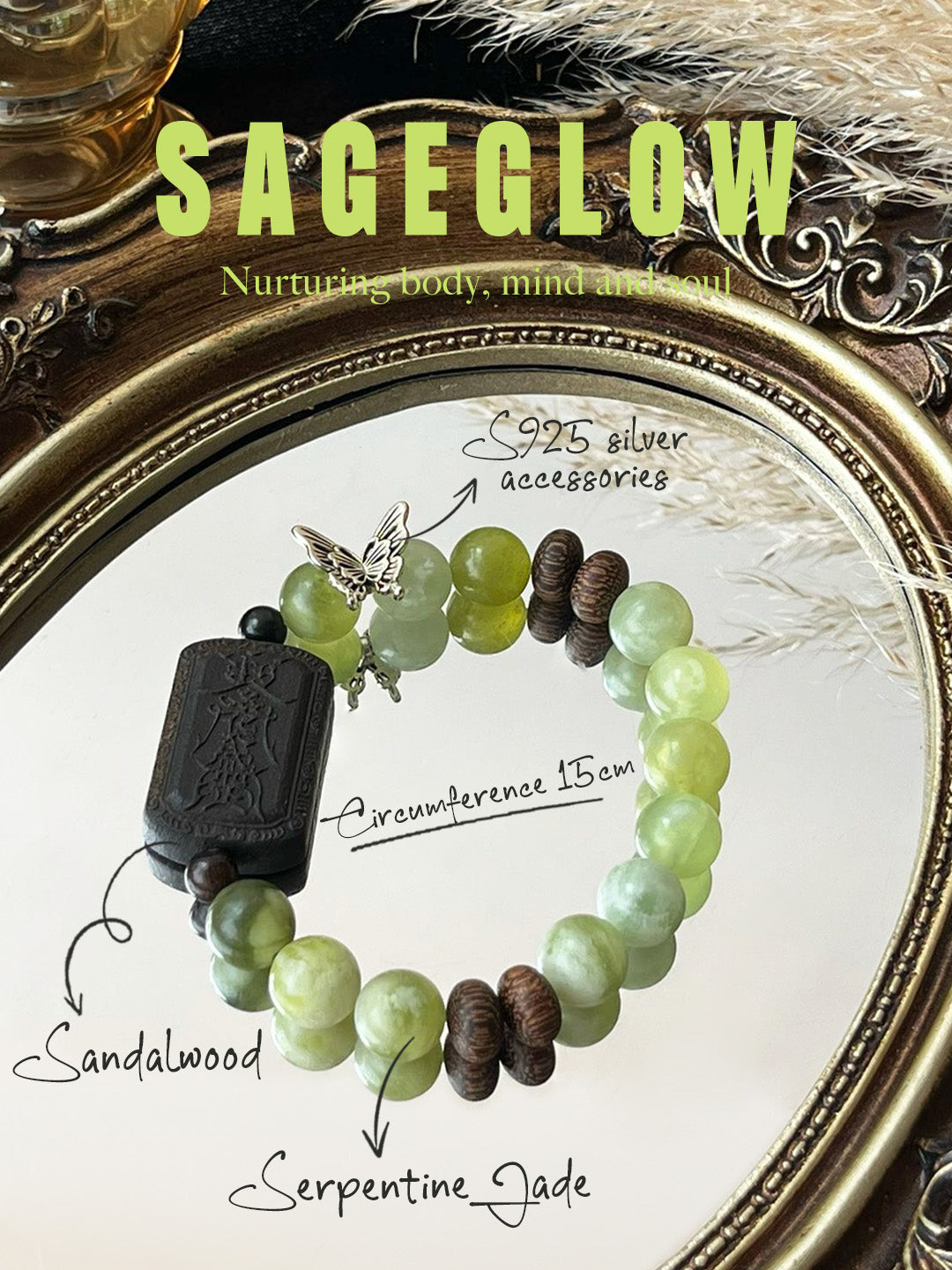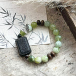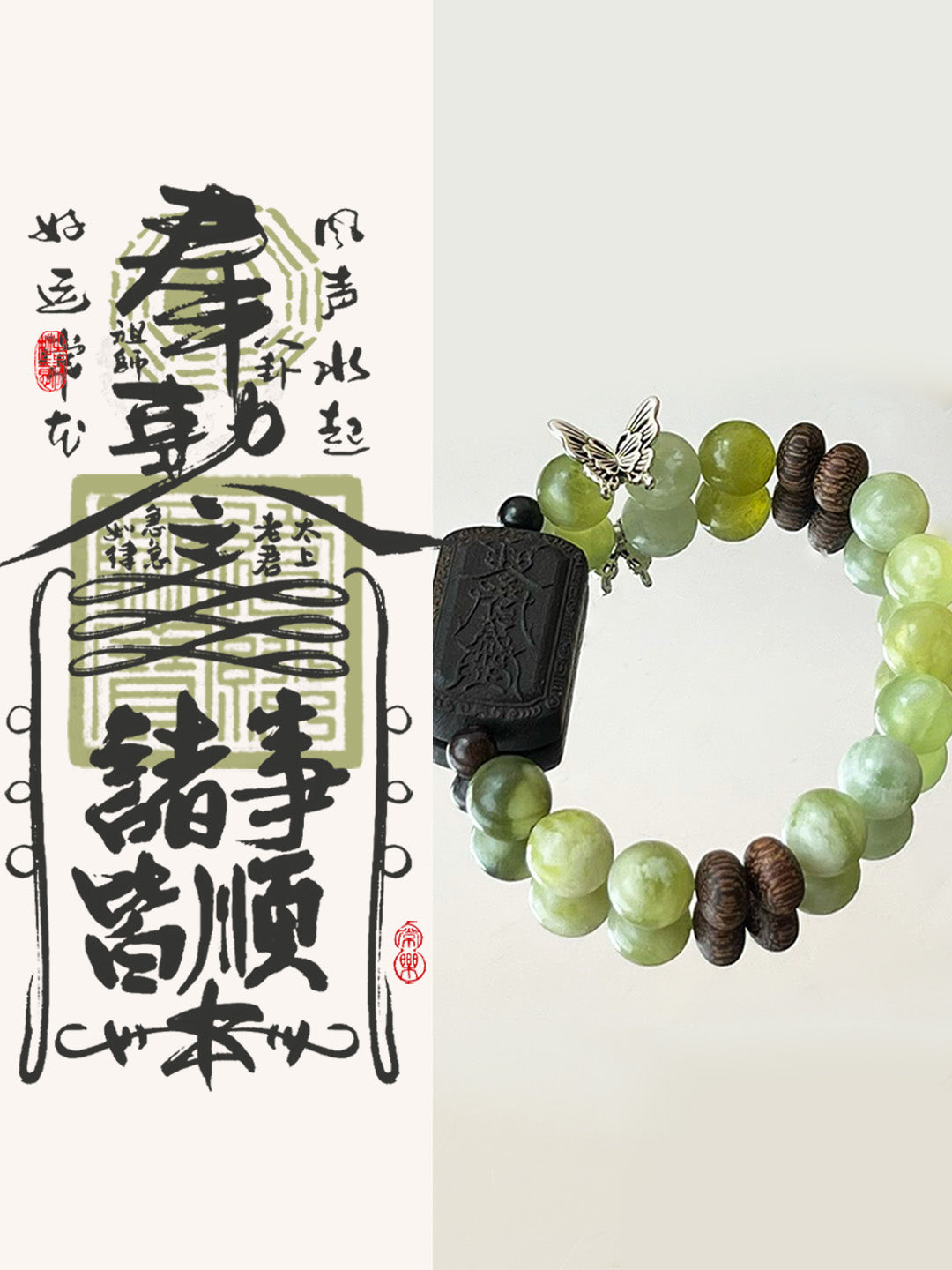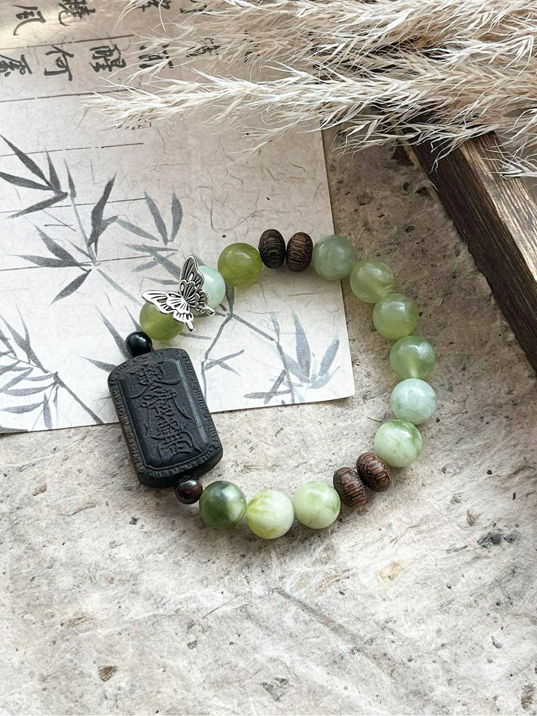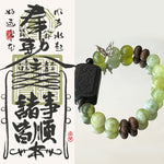 The Whispering Jade Butterfly Bracelet is a masterpiece that captures the essence of the Wood (木) element in the Wu Xing (Five Elements) system. With square Agarwood blocks engraved with traditional Chinese talismans, this bracelet channels the natural healing power of the Wood element, promoting growth, renewal, and vitality. Paired with the calming energy of green Serpentine Jade, it fosters balance, compassion, and emotional healing.