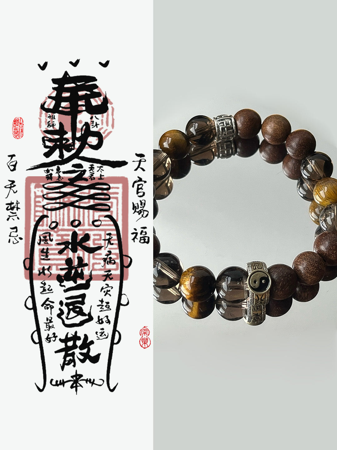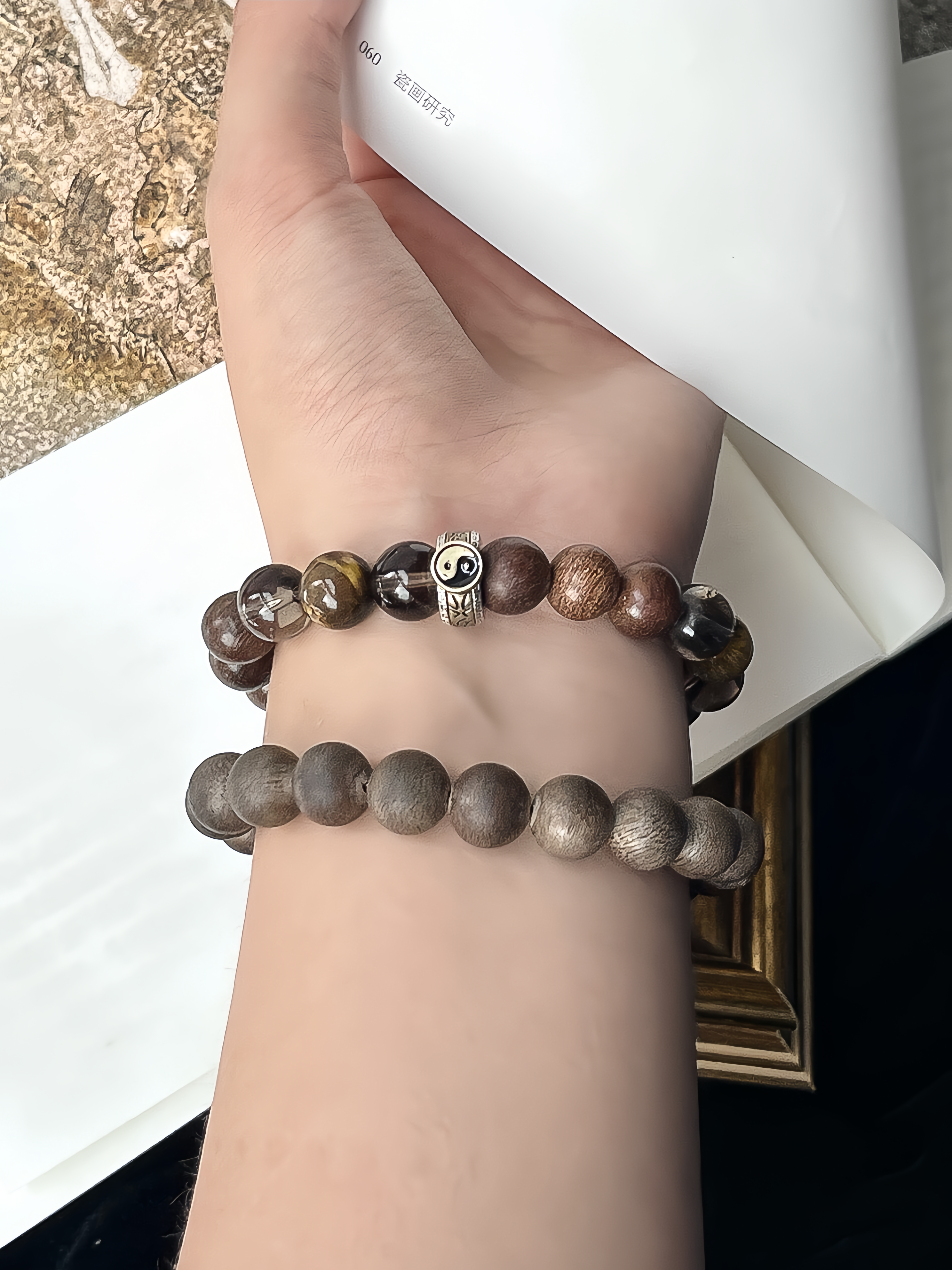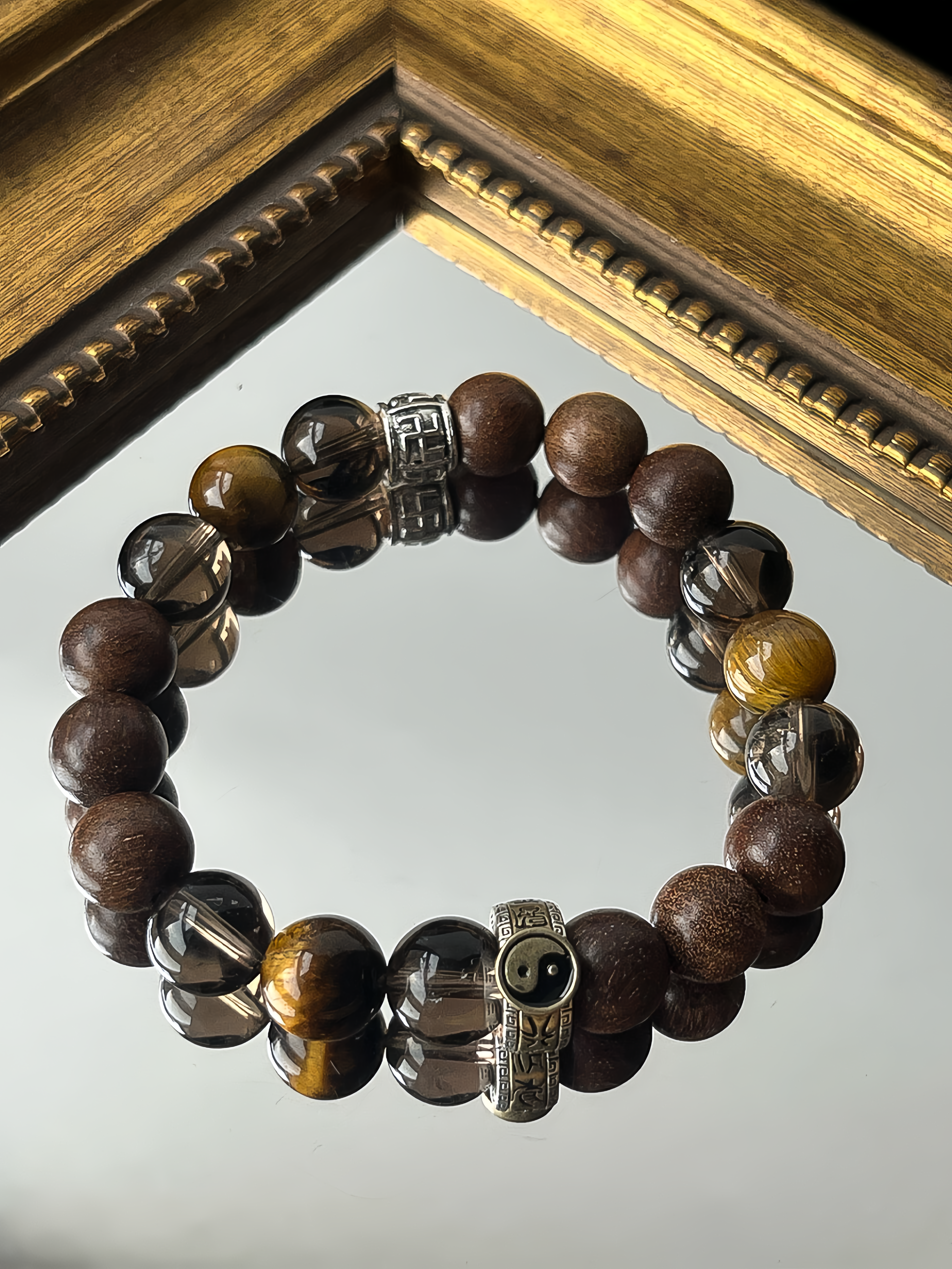 The Yin-Yang Grounding Bracelet is a perfect embodiment of balance and strength, drawing deeply from ancient Chinese philosophy. Crafted from Smoky Quartz, Tiger’s Eye, and Golden Sandalwood, this bracelet integrates the timeless wisdom of Yin-Yang and Bagua (Eight Trigrams), harmonizing opposing forces and promoting inner peace.